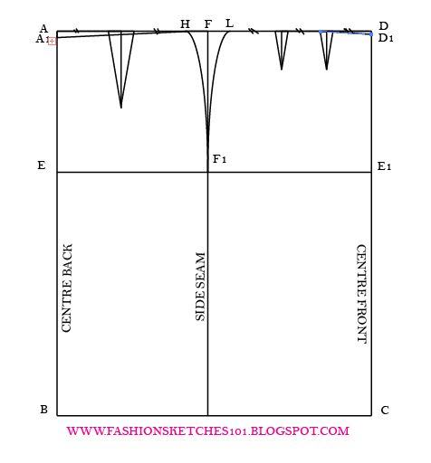 On the back side of the skirt H-F, the dart width should not exceed 4.5 to 5 cm